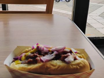 We have a full topping bar. Chili, cheese, onions, peppers, cole slaw. Come get messy with it